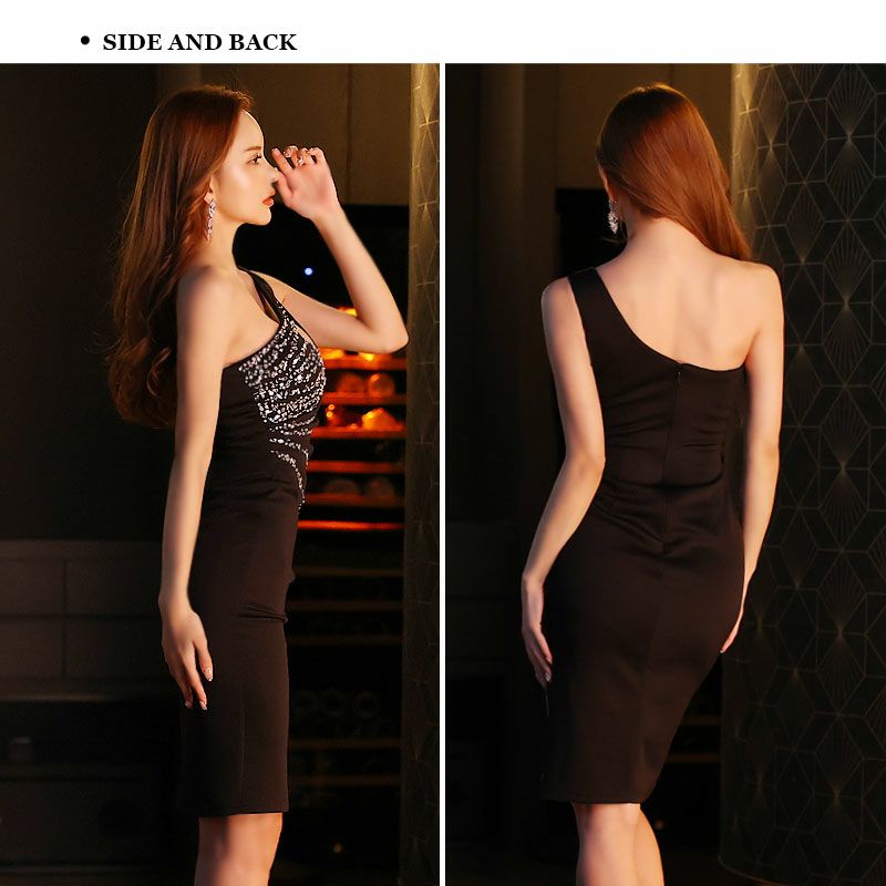 4. [Veautt/ヴュート] 高級 ビジュー ワンショルダー バストカット ジップ 谷間魅せ ファスナースリット タイト 膝丈ドレス