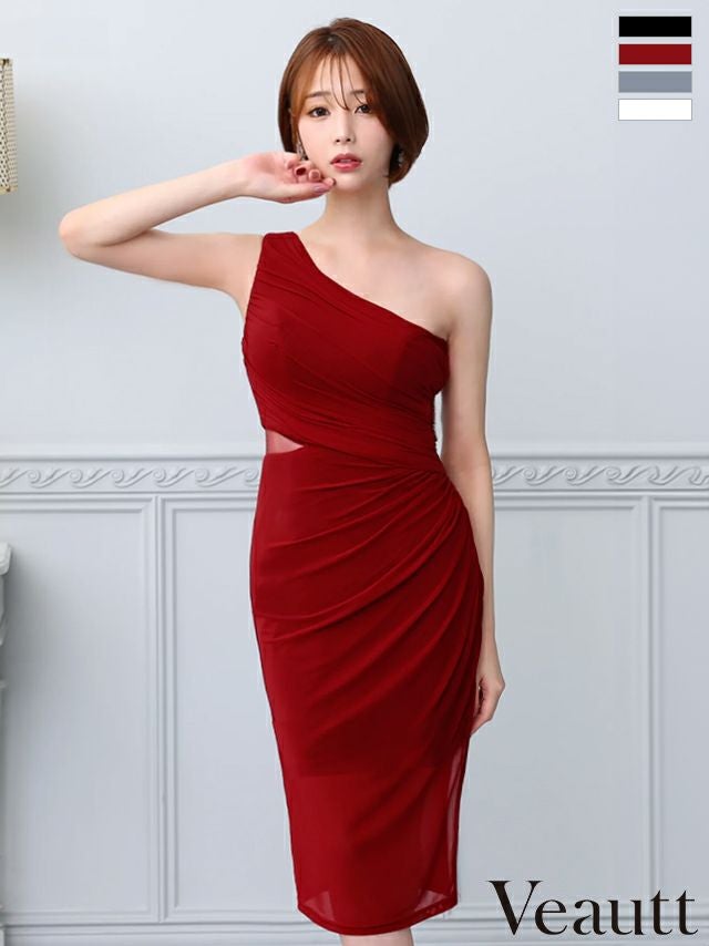4. [Veautt/ヴュート] 高級ワンショルダーウエストカットラメタイト膝丈ドレス