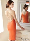 キャバドレス 小さいサイズ Veautt ヴュート 高級バックヌーディークロスパールプアメリカンスリーブフロントジッスリットタイト膝丈ドレス