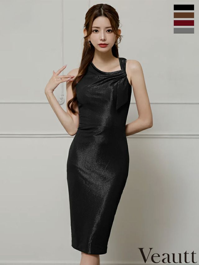 シンプルで魅せる上品ドレス♡ [Veautt/ヴュート] 高級 ブランド タイト膝丈ドレス ノースリーブ アシンメトリー リボン ラメ