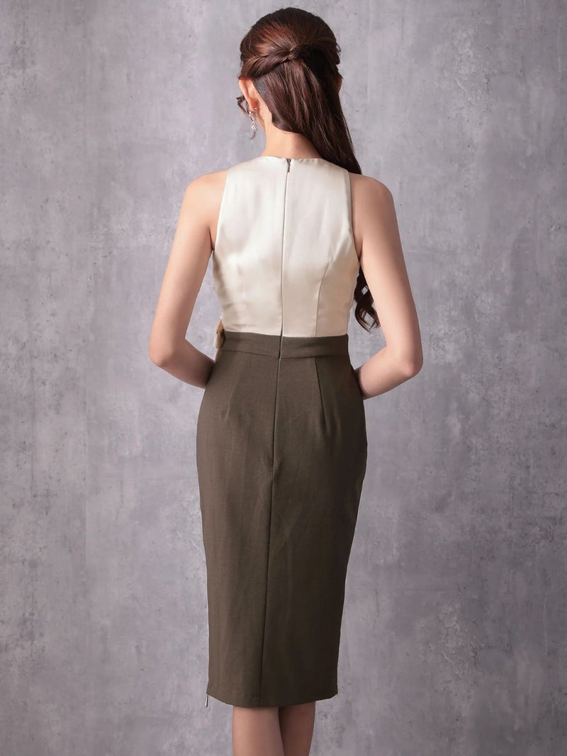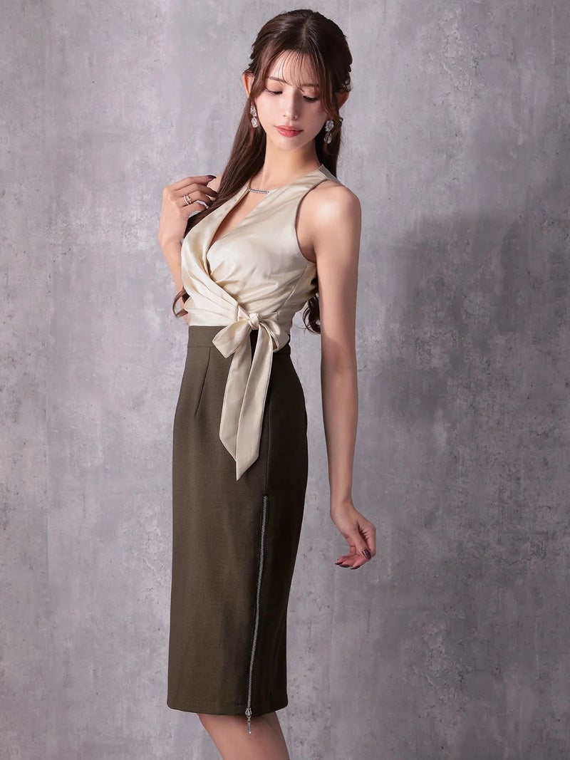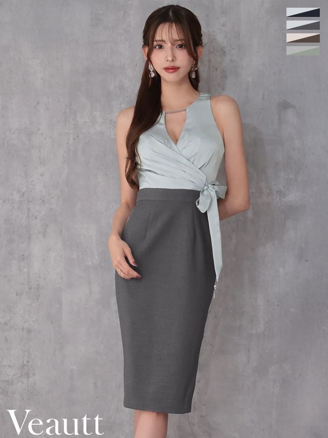 バイカラーでメリハリボディに♡ [Veautt/ヴュート] 高級 ブランド タイト膝丈ドレス 谷間 ノースリーブ バストチェーン ウエストリボン バイカラー ジップスリット (ゆいぴす着用)