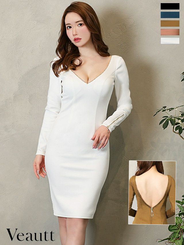 5. [Veautt/ヴュート] 高級バストビジューバックオープンファスナー長袖 袖ありタイト膝丈ドレス