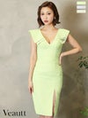 煌めくビジューが上品な印象もプラス☆ [Veautt/ヴュート] 高級 ビックカラー 襟付き ビジュー ツイード ノースリーブ タイト膝丈ドレス