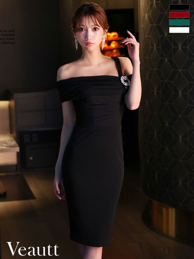 5. [Veautt/ヴュート] 高級オフショルダージップワンカラービジュータイト膝丈ドレス