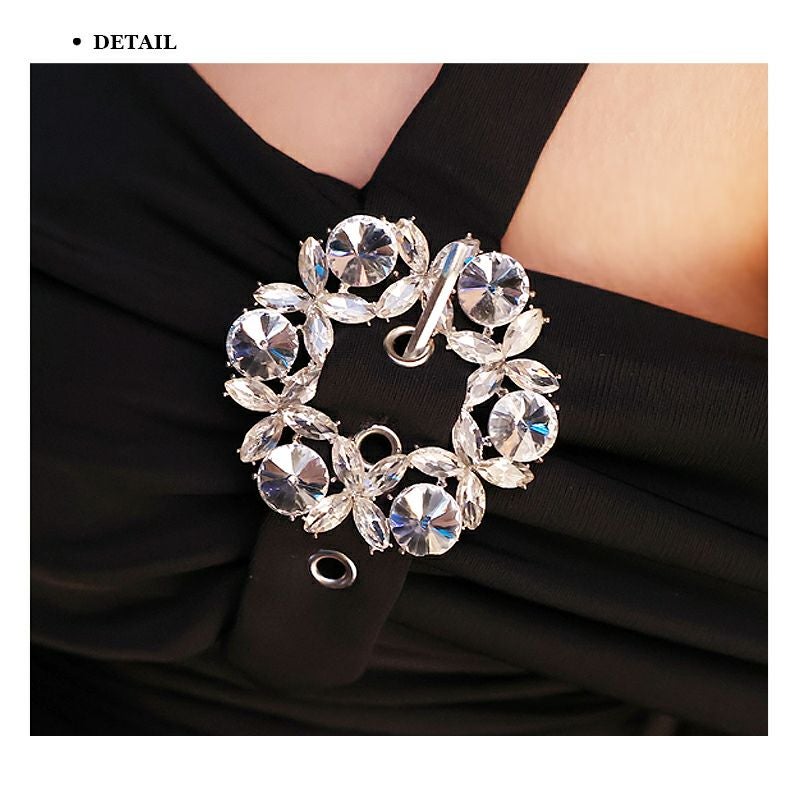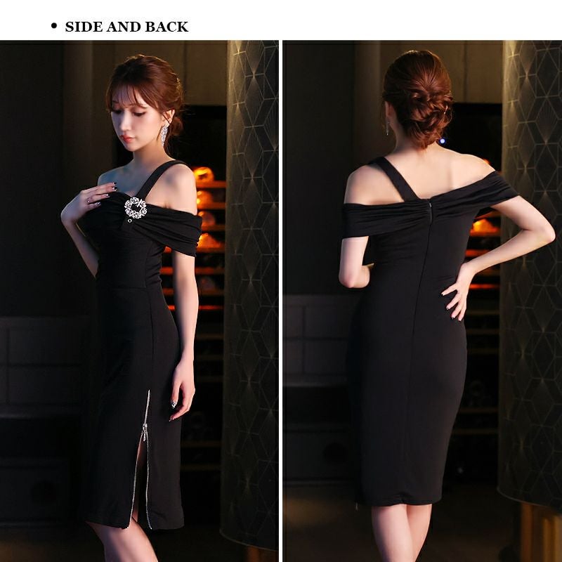 シンプルなデザインが魅力的☆ [Veautt/ヴュート] 高級オフショルダージップワンカラービジュータイト膝丈ドレス