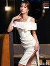 シンプルなワンカラーで魅力的に☆ [Veautt/ヴュート] 高級オフショルダージップシンプルワンカラータイト膝丈ドレス