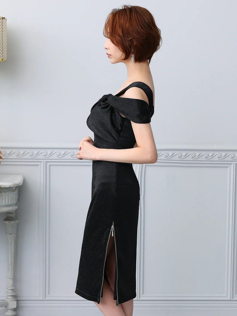 4. [Veautt/ヴュート] 高級 ワンショルダー ラメ ワンカラー ファスナースリット タイト 膝丈ドレス