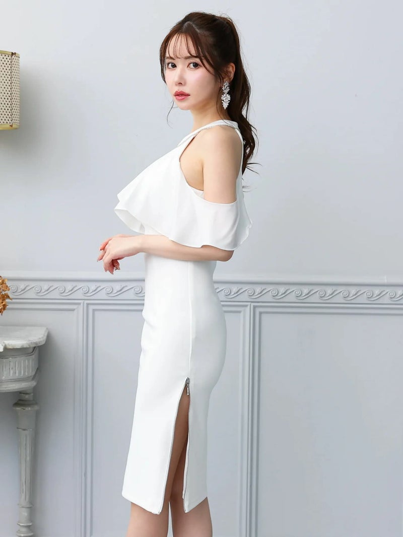 5. [Veautt/ヴュート] 高級 肩出し 二の腕カバー ホルターネック ワンカラー ファスナースリット タイト 膝丈ドレス