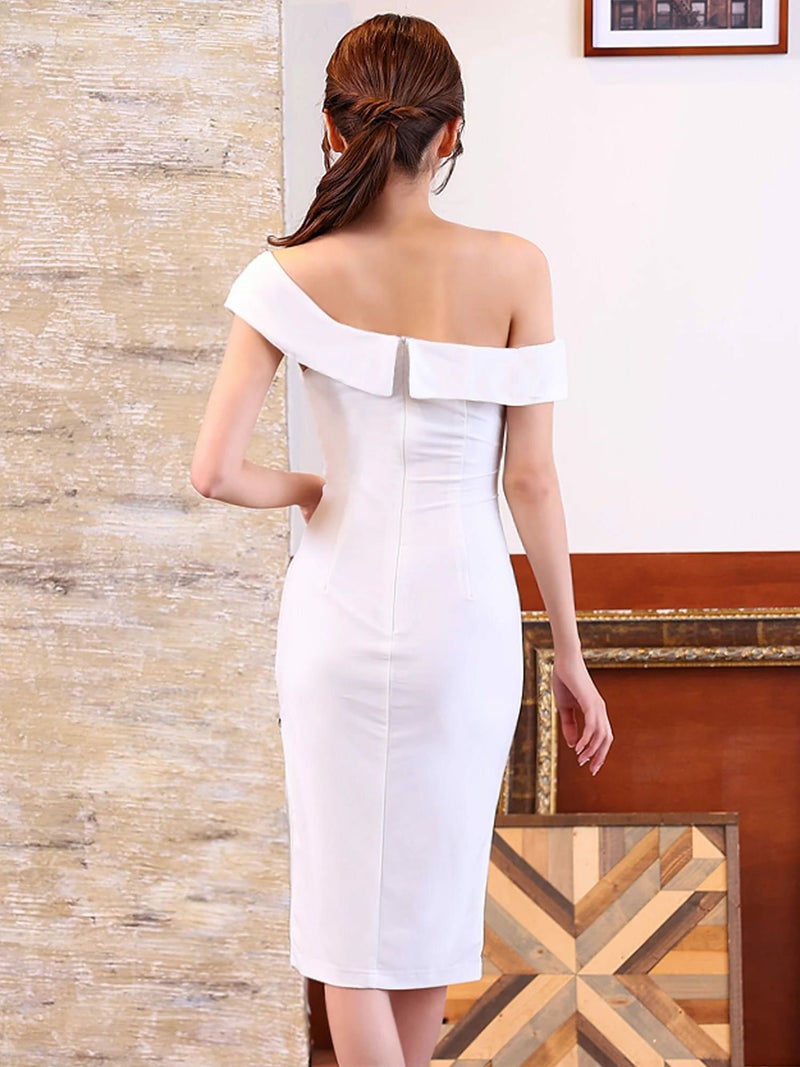 セクシーな肌見せを叶える☆ [Veautt/ヴュート] 高級 ワンショルダー ウエストタック ビジュー ファスナースリット タイト 膝丈ドレス