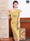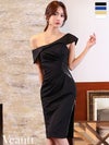 大人の気品溢れる1着☆ [Veautt/ヴュート] 高級 ワンショルダー ウエストタック ビジュー ファスナースリット タイト 膝丈ドレス