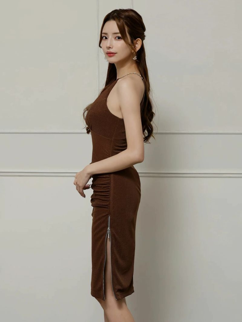 大人のエレガンスを纏う1着♡ [Veautt/ヴュート] 高級 ブランド タイト膝丈ドレス ホルターネック スリット デコルテシアー ビジューチェーン