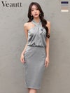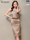 ワンカラーで洗練された印象に♡ 予約商品【3月下旬入荷予定】[Veautt/ヴュート] 高級 ブランド タイト膝丈ドレス クロスホルターネック 胸元フリル ドレープ サテン ワンカラー スリット