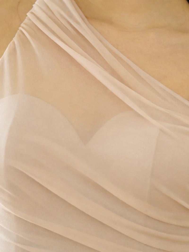 5. 予約商品【5月下旬入荷予定】[Veautt/ヴュート] 高級 ブランド 膝丈ドレス ワンショルダー ビジュー シアー バストシースルー タック ワンカラー