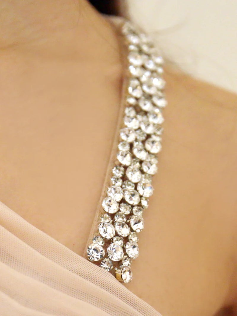 3. 予約商品【5月下旬入荷予定】[Veautt/ヴュート] 高級 ブランド 膝丈ドレス ワンショルダー ビジュー シアー バストシースルー タック ワンカラー