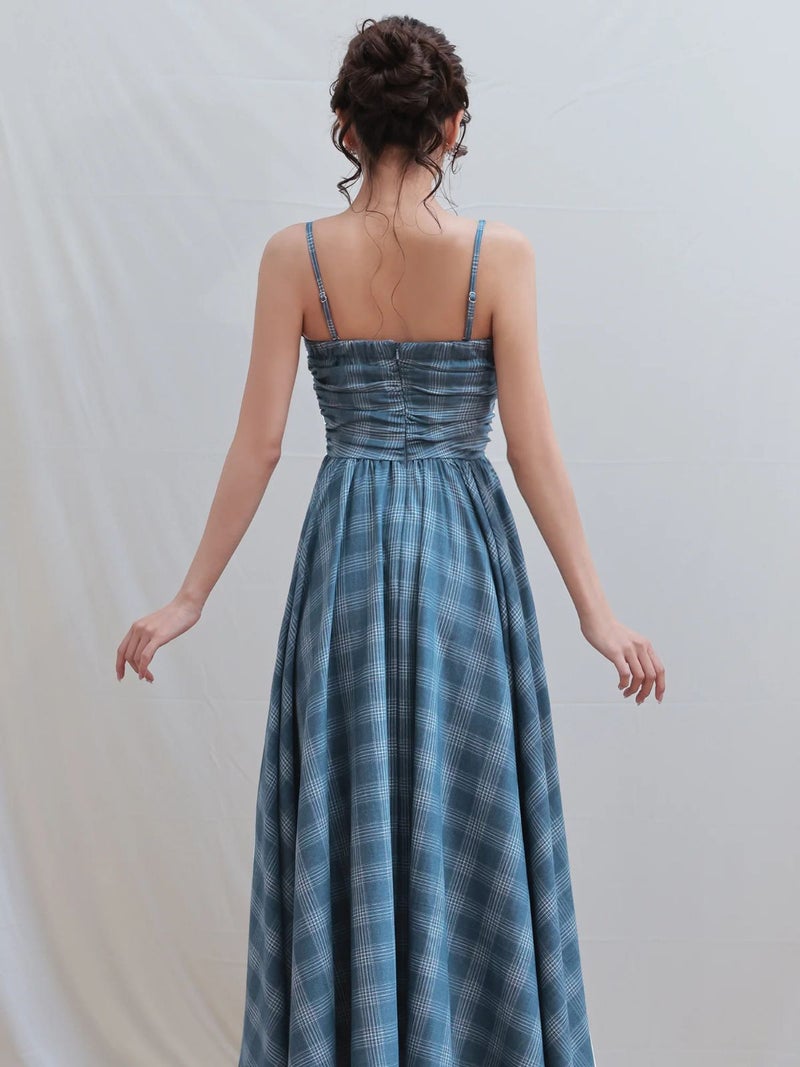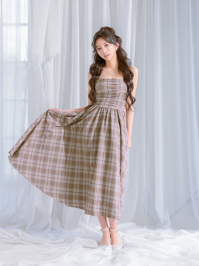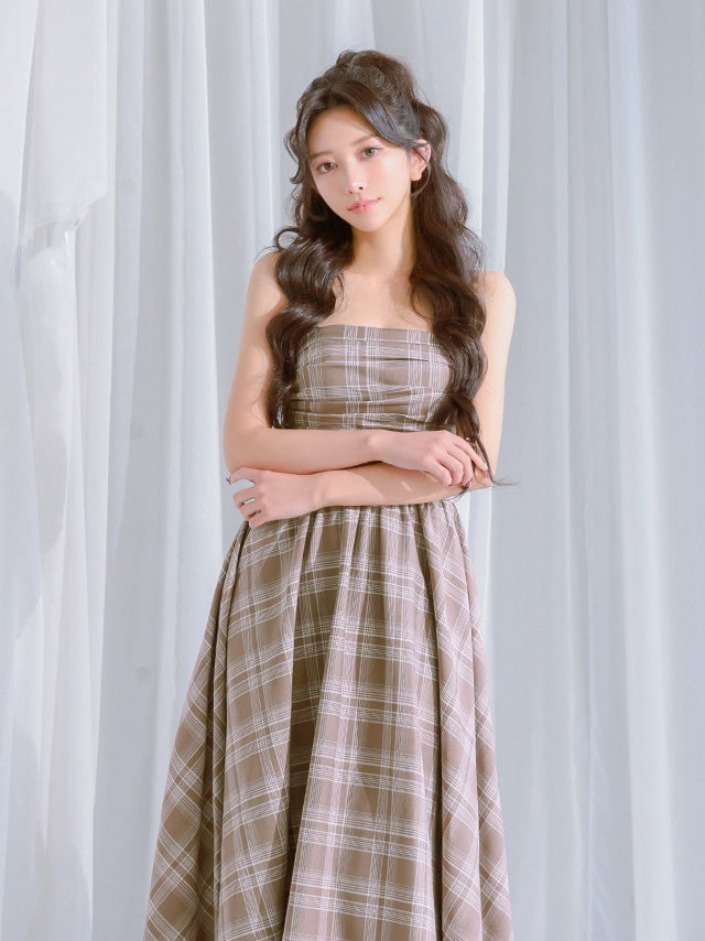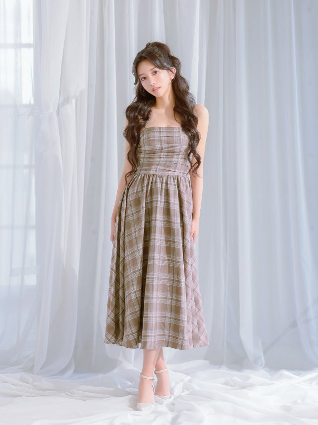 4. [Veautt/ヴュート] 高級 ブランド Aライン 膝丈ドレス ベア キャミソール 2way チェック柄 胸元カバー ギャザー (ゆいぴす着用)