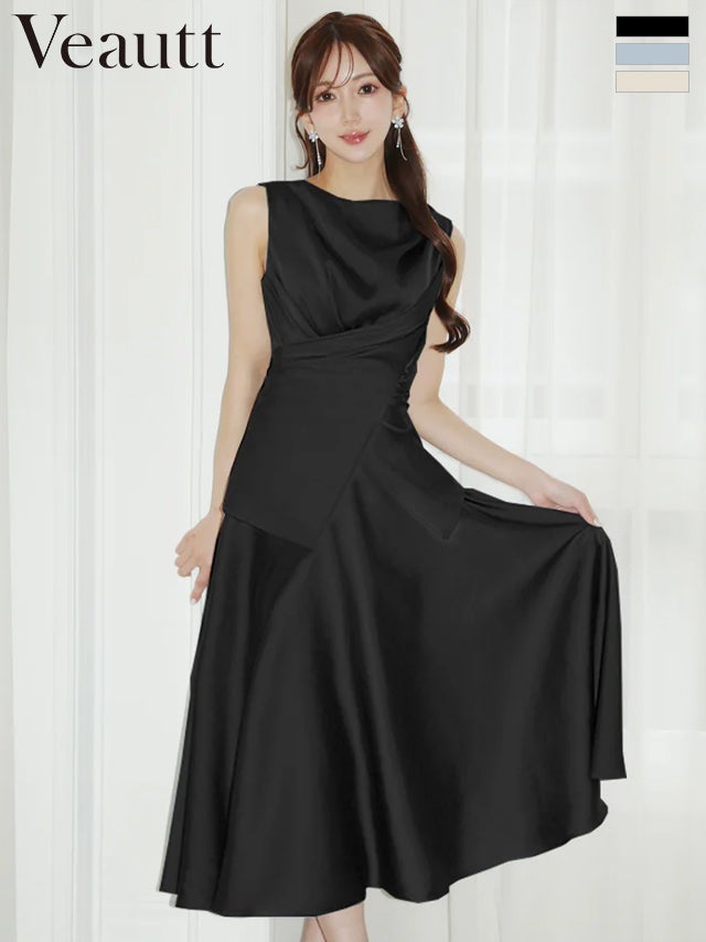 柔らかい光沢感のあるデザイン♡ [Veautt/ヴュート] 高級 ブランド Aライン膝丈ドレス セットアップ ノースリーブ ウエストクロスデザイン バックリボン ドレープ