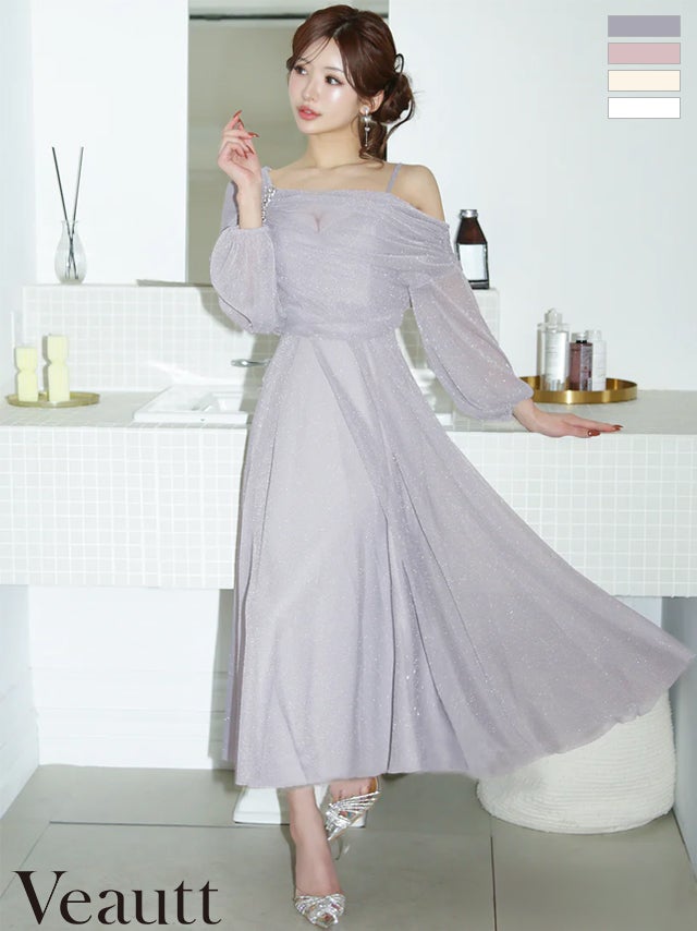 程良い肌魅せでエレガントな女性に♡ [Veautt/ヴュート] 高級 ブランド Aライン膝丈ドレス 長袖 アシンメトリー ビジュー ドレープデザイン ラメ メッシュ