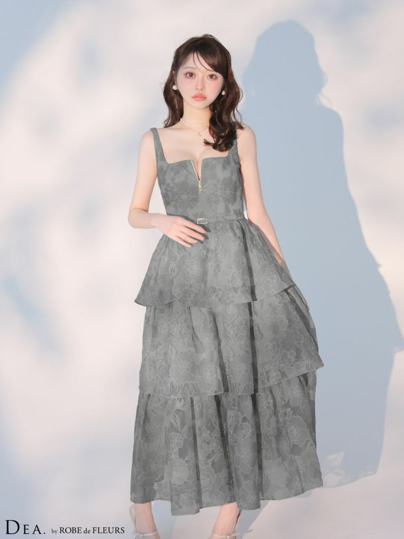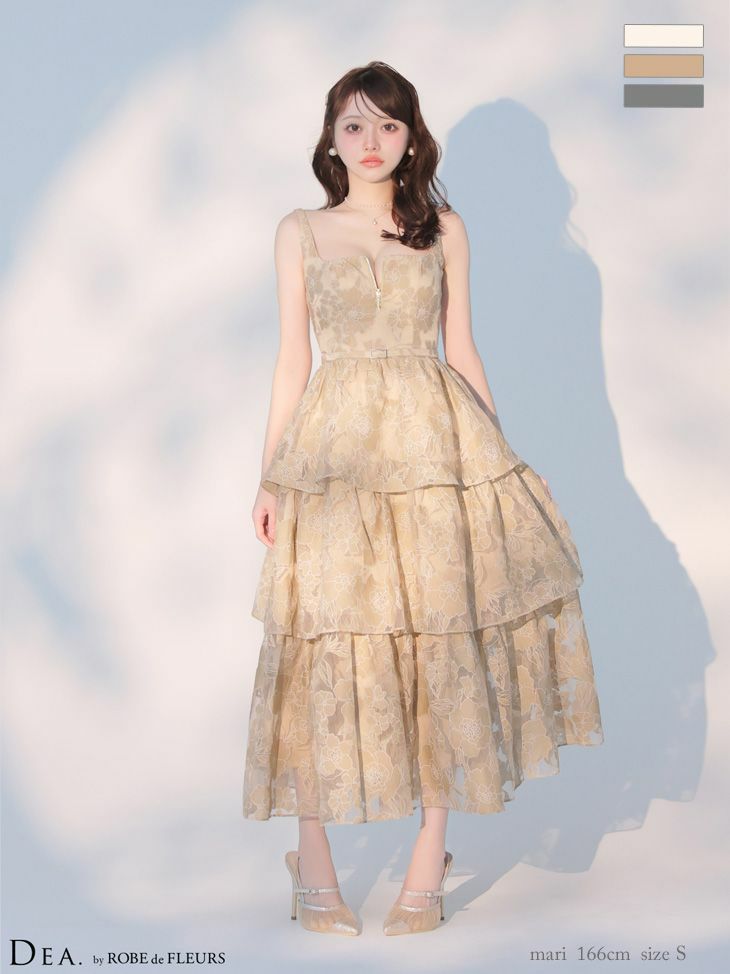 動いても美しい1着♡ [DEA.byROBEdeFLEURS/ディアバイローブドフルール] 高級 ブランド ワンピース Aラインロングドレス キャミソール ジップ ウエストベルト フラワー ティアードフリル オーガンジー