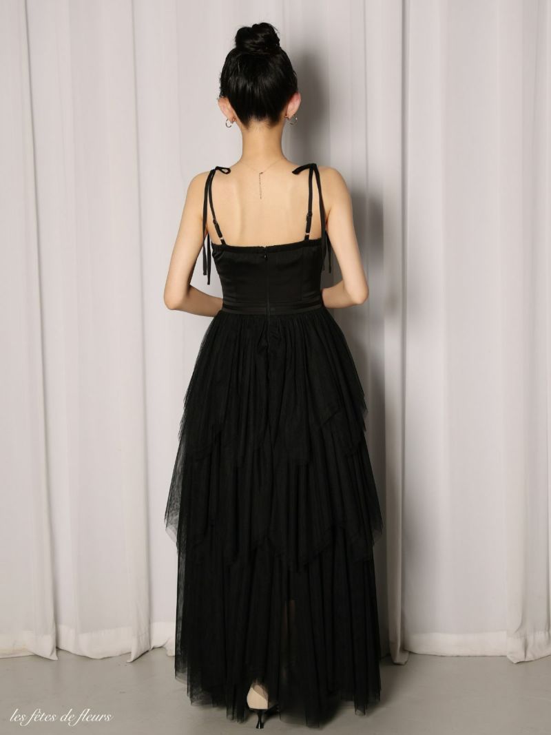 6. [ROBEdeFLEURS/ローブドフルール] 高級 ブランド Aラインロングドレス 谷間 キャミソール ウエストベルト ティアード チュール ドレープ ショルダーリボン