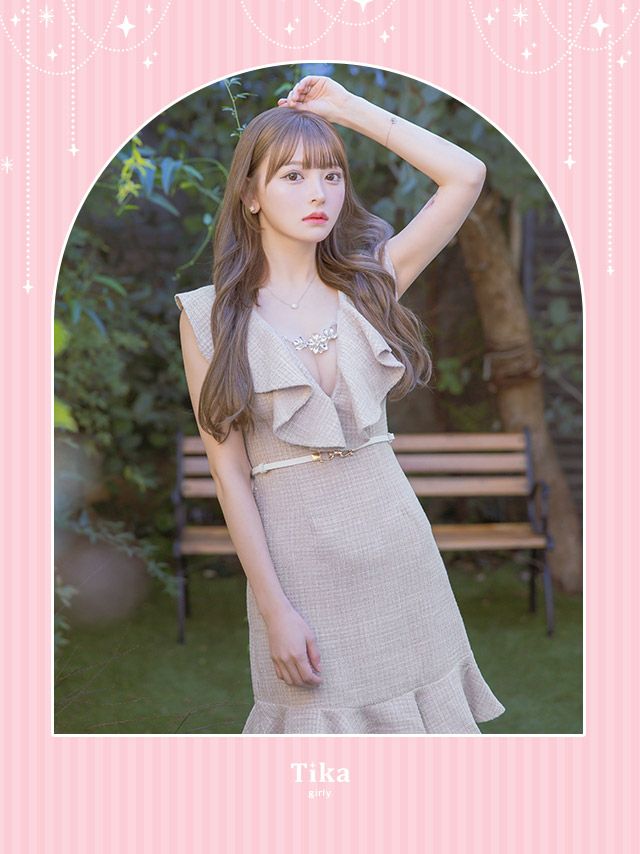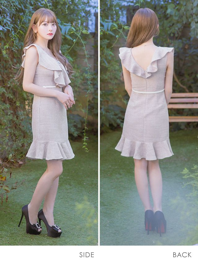 3. [SALE] デコルテビジュー ウエストベルト付き 胸元フリル ツイード マーメイド バストシースルー 谷間魅せ タイト 膝丈ドレス (Sサイズ~XLサイズ) (黒崎みさ/キャバドレス着用)