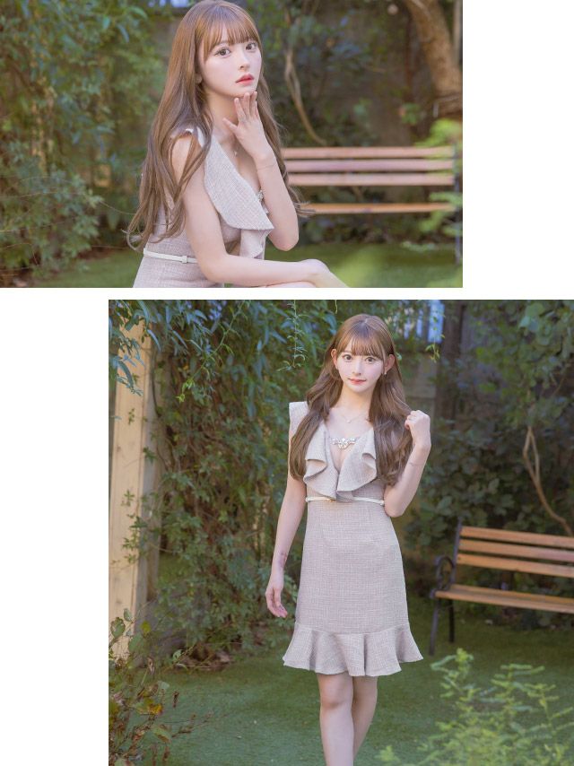 4. [SALE] デコルテビジュー ウエストベルト付き 胸元フリル ツイード マーメイド バストシースルー 谷間魅せ タイト 膝丈ドレス (Sサイズ~XLサイズ) (黒崎みさ/キャバドレス着用)