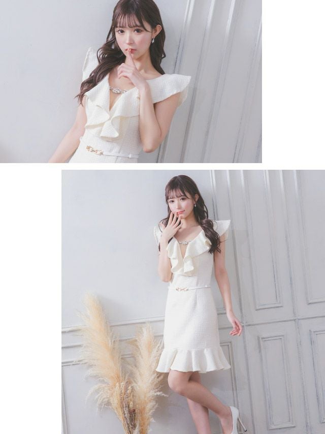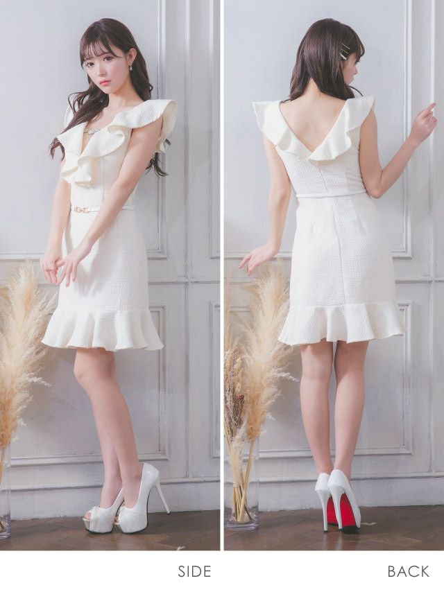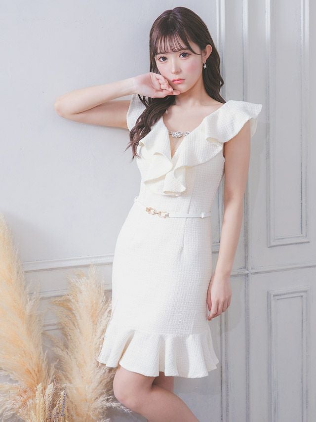 キラキラビジュー&フリルVネックであざとく谷間を強調♪ [SALE] デコルテビジュー ウエストベルト付き 胸元フリル ツイード マーメイド バストシースルー 谷間魅せ タイト 膝丈ドレス (Sサイズ~XLサイズ) (黒崎みさ/キャバドレス着用)