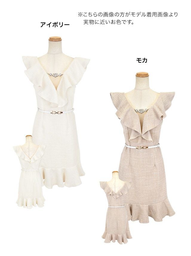 デコルテビジュー&ウエストベルト付き胸元フリルツイードマーメイド膝丈タイトドレスの商品詳細1