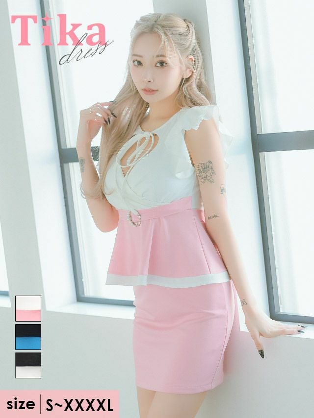 4. カシュクール ネックリボン ノースリーブ フリルペプラ ムウエストベルト切り替え バイカラー バストカット 谷間魅せ タイトミニドレス (Sサイズ~XXXXLサイズ) (みゆう/キャバドレス着用)