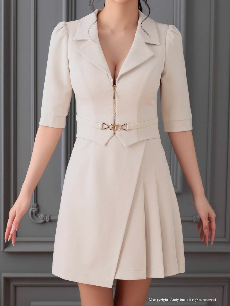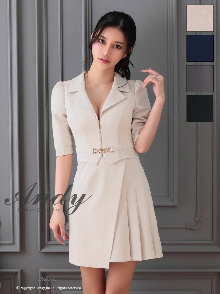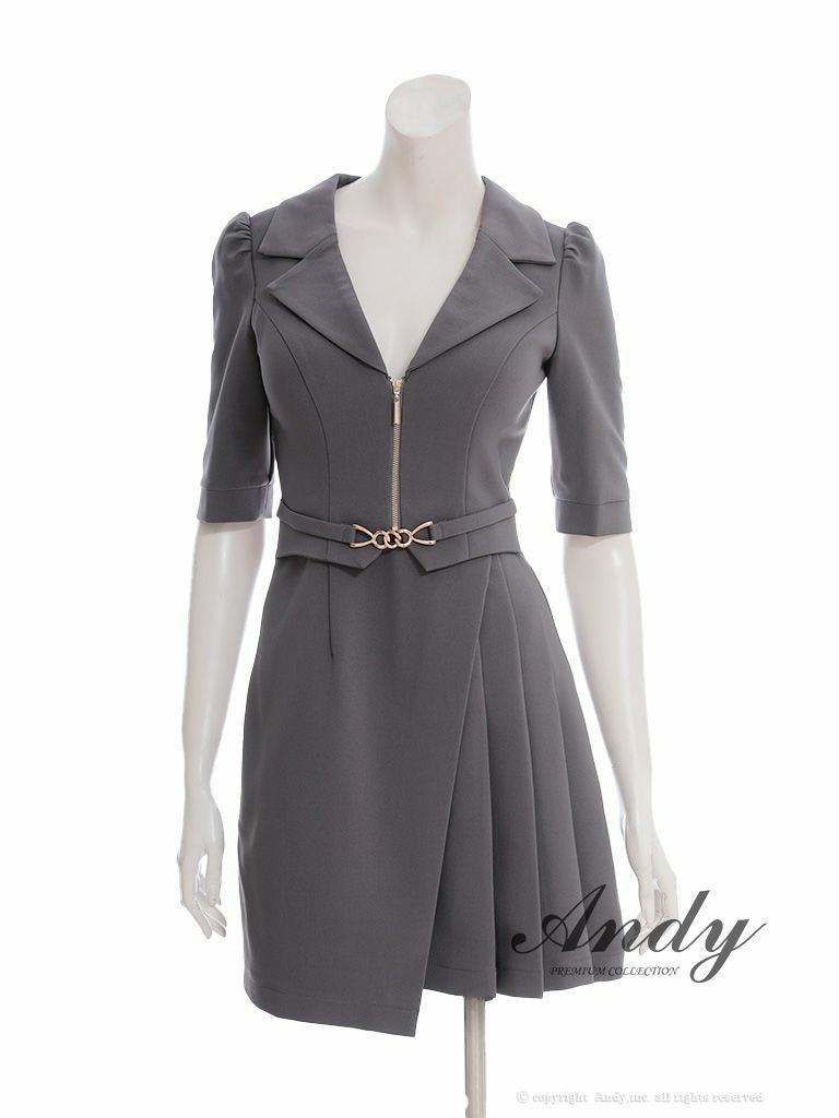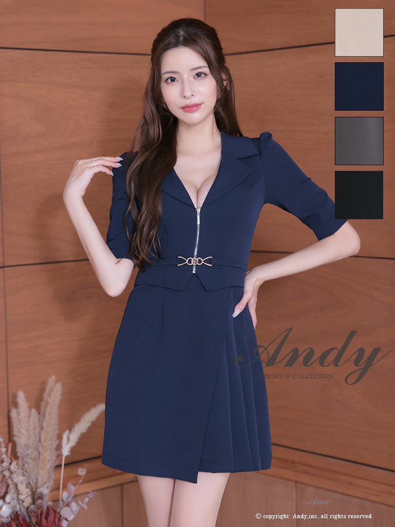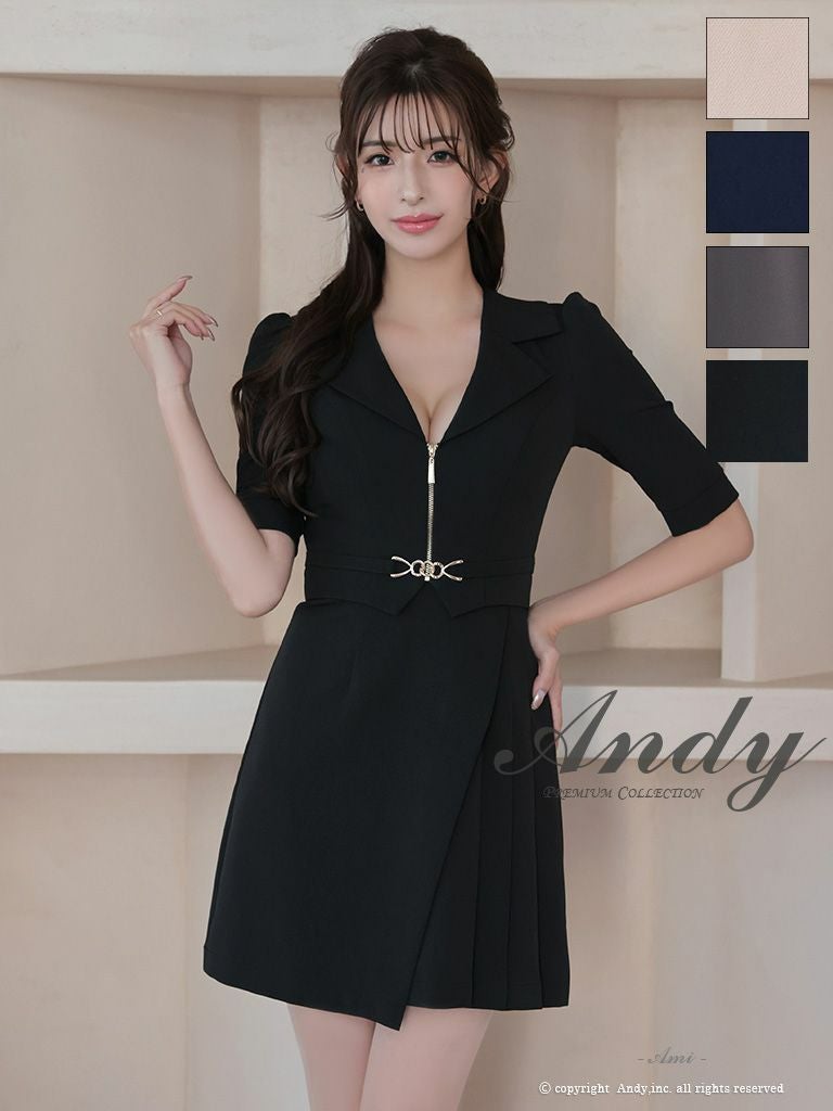 5. [Andy/アンディ] 高級 袖あり 襟付き ウエストベルト ジップデザイン フレアミニドレス