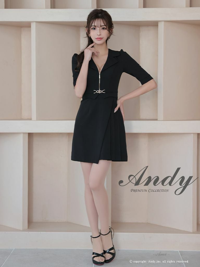 6. [Andy/アンディ] 高級 袖あり 襟付き ウエストベルト ジップデザイン フレアミニドレス