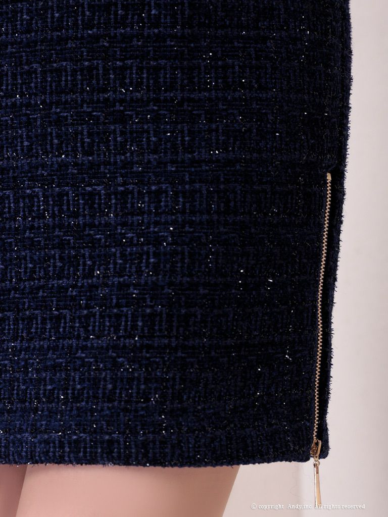 ラメツイードが上品に煌めく☆ [Andy/アンディ] 高級 2way 長袖 袖あり 襟付き ジップ ラメ ツイード ウエストベルト タイトミニドレス