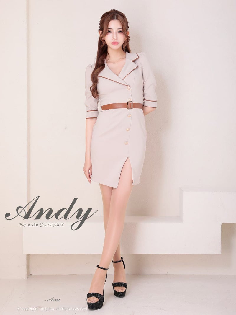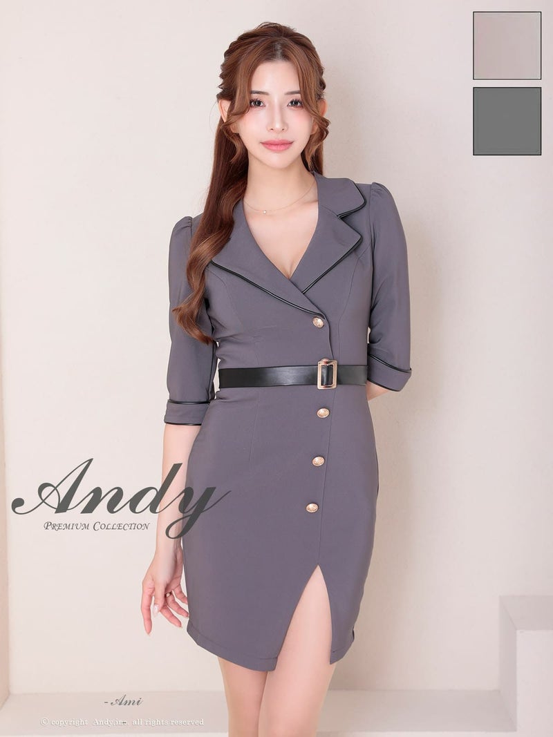キャバドレス Andy アンディ  高級 袖あり 五分袖 襟付き スリット ウエストベルト 谷間 タイトミニドレス