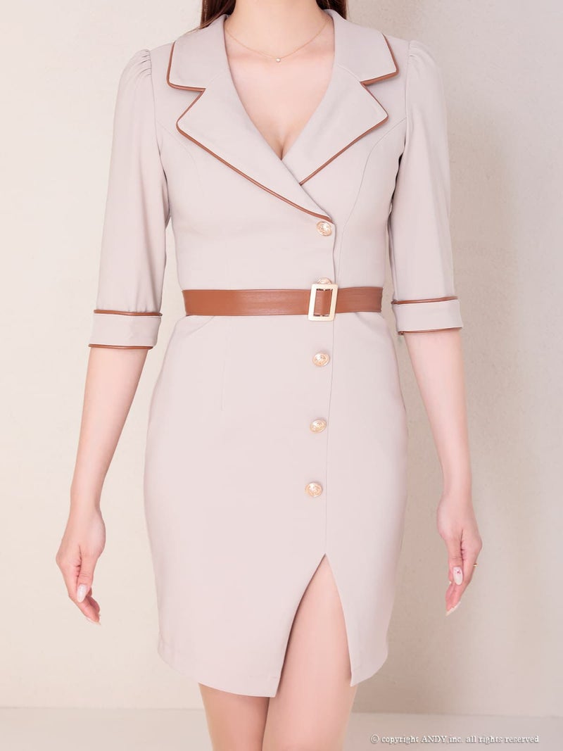 6. [Andy/アンディ] 高級 袖あり 五分袖 襟付き スリット ウエストベルト 谷間 タイトミニドレス