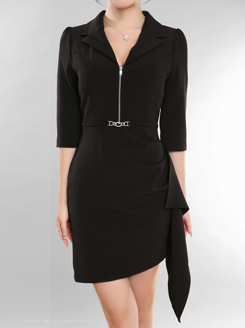 [Andy/アンディ] 高級 タイト ミニドレス 谷間 大人 袖あり ウエストベルト 襟付き ジップ