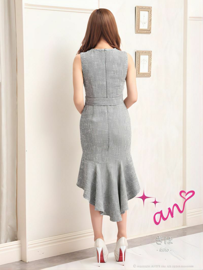 キャバドレス an アン 高級ツイードウエストベルトフリルマーメイドノースリーブ膝丈ドレス