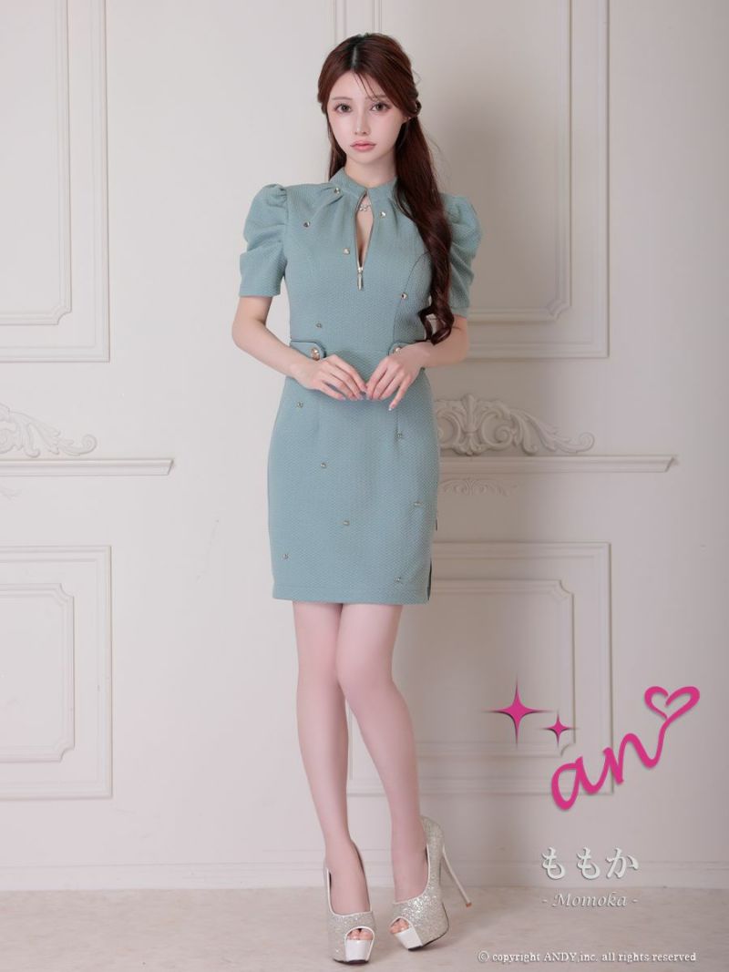 キャバドレス Andy アンディ 高級 半袖 ファスナースリット ジップデザイン ボタン ウエストリボン タイトミニドレス