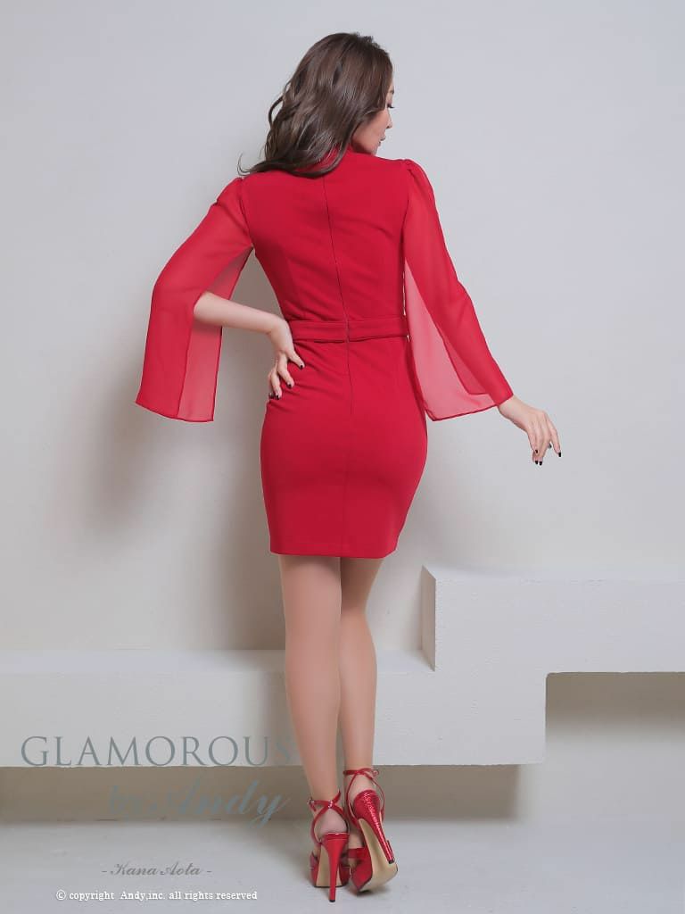 ケープ袖で周囲と違った魅力を+ [AndyGLAMOROUS/アンディグラマラス] 高級 フロントジップ ウエストベルト 取り外し シフォン 袖あり ノースリーブ バストカット 谷間魅せ タイトミニドレス