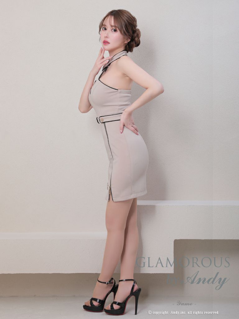 キャバドレス AndyGLAMOROUS アンディグラマラス 高級ホルターネックワンショルダーチェーンジップウエストベルトタイトミニドレス