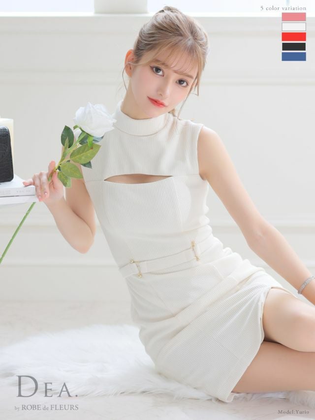 上品な色っぽさを演出します...♡ [DEA.byROBEdeFLEURS/ディアバイローブドフルール] 高級 ワンカラー ハイネック バストカット ベルトデザイン ノースリーブ 谷間魅せ タイトミニドレス