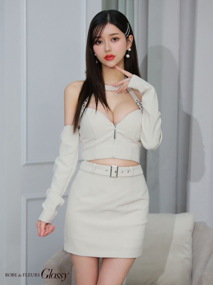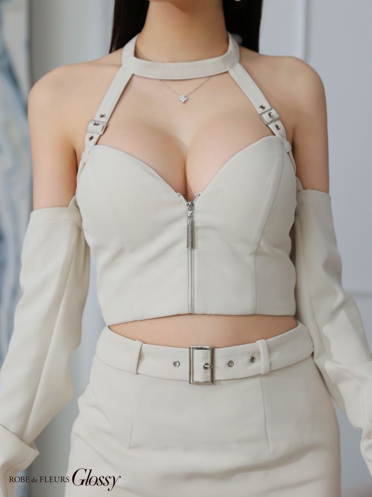 5. SALE [ROBEdeFLEURSGlossy/ローブドフルールグロッシー] 高級 ホルターネック リボン 2way ウエストベルト ジップ セットアップ バストカット 谷間魅せ タイトミニドレス