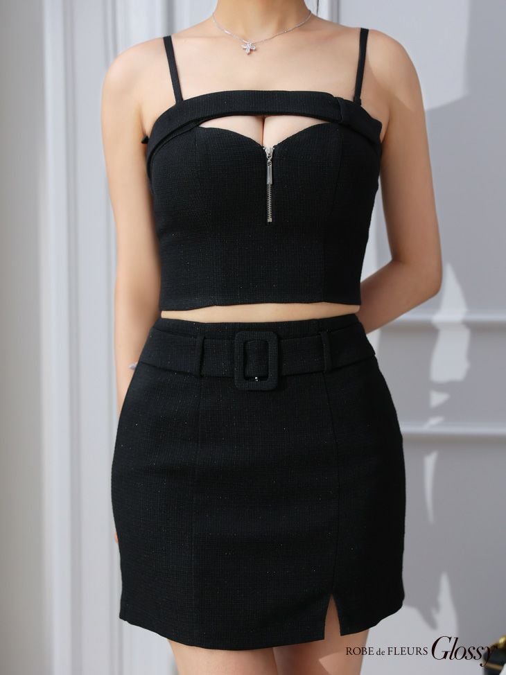 クールな大人女性にメイク★ SALE [ROBEdeFLEURSGlossy/ローブドフルールグロッシー] 高級 バストカット ジップ ワンカラー ウエストベルト セットアップ 2way キャミソール 谷間魅せ タイトミニドレス