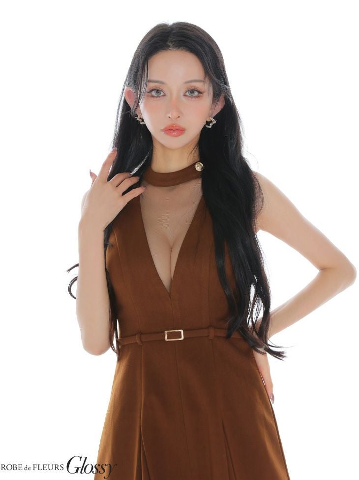 大胆なVカットで視線を集める♡ [ROBEdeFLEURSGlossy/ローブドフルールグロッシー] 高級 ブランド Aラインミニドレス 谷間 ノースリーブ ウエストベルト バストシースルー プリーツ
