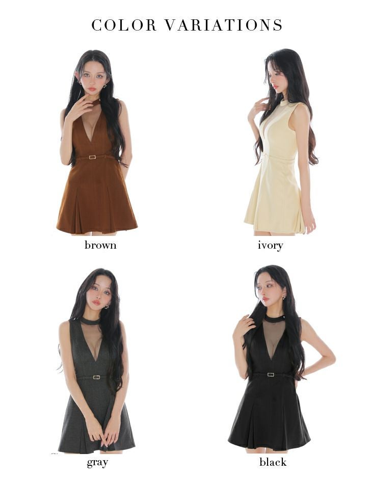 4. [ROBEdeFLEURSGlossy/ローブドフルールグロッシー] 高級 ブランド Aラインミニドレス 谷間 ノースリーブ ウエストベルト バストシースルー プリーツ