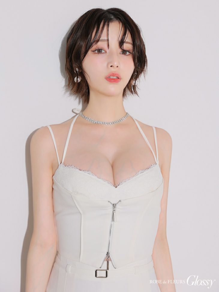 4. [ROBEdeFLEURSGlossy/ローブドフルールグロッシー] 高級 キャミソール ネックリボン セットアップ ウエストベルト レース ジップ フレアミニドレス