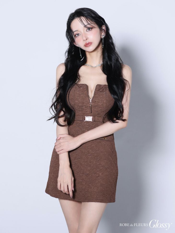 6. [ROBEdeFLEURSGlossy/ローブドフルールグロッシー] 高級 ブランド タイトミニドレス 谷間 キャミソール 背中魅せ ウエストベルト ジップ ワッフル ワンカラー