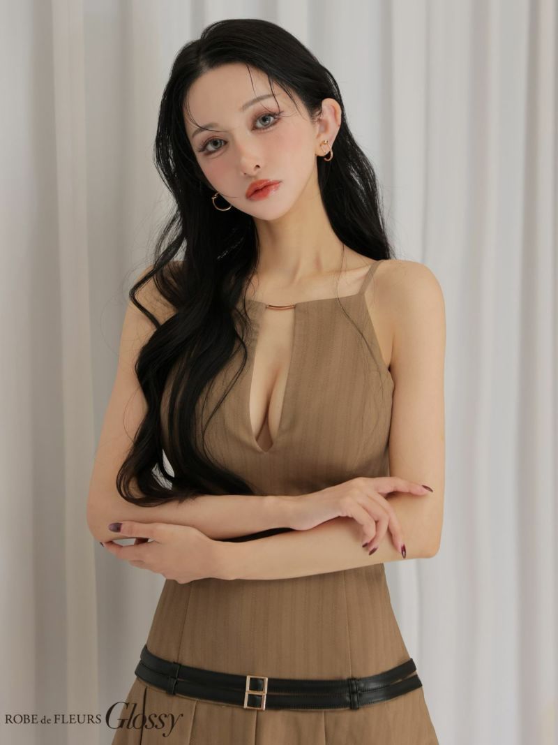 大胆なバックスタイルで視線独占♡ [ROBEdeFLEURSGlossy/ローブドフルールグロッシー] 高級 ブランド Aラインミニドレス 谷間 ホルターネック 背中魅せ ウエストベルト レザー バストカット プリーツ ヘリンボーン