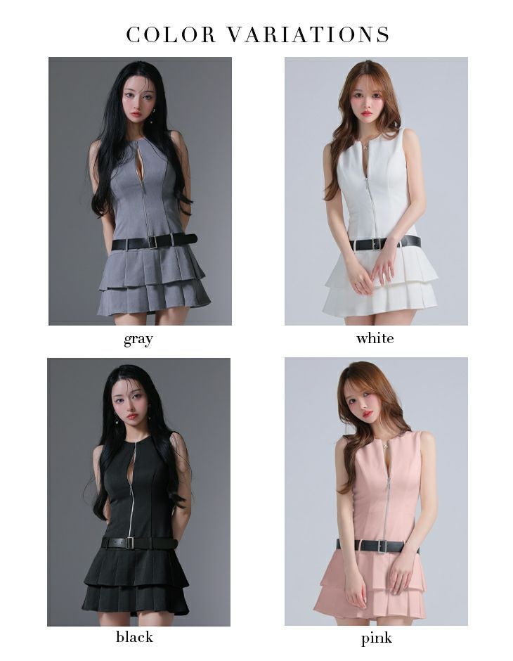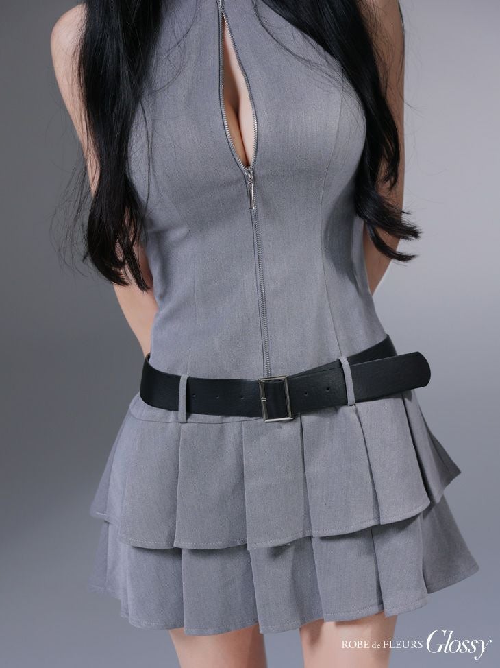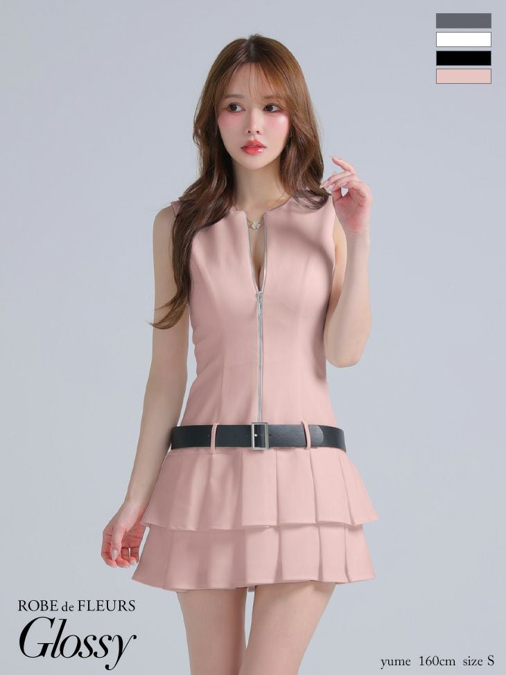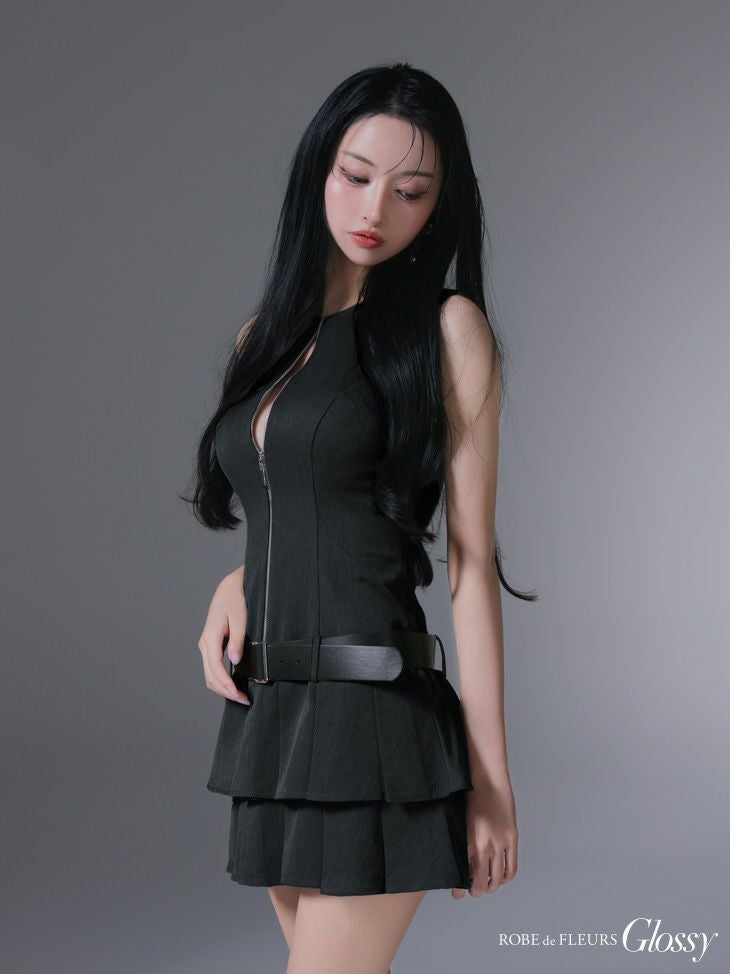 フロントジップがセクシーさをプラス♡ [ROBEdeFLEURSGlossy/ローブドフルールグロッシー] 高級 ノースリーブ バストジップ ウエストベルト プリーツ フレアミニドレス