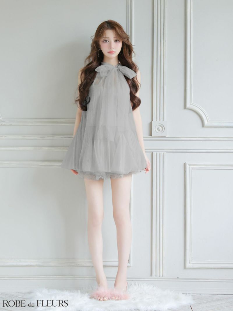 ふんわりシルエットで女性らしさ溢れる♡ [ROBEdeFLEURS/ローブドフルール] 高級 ブランド Aラインミニドレス セットアップ ホルターネック ウエストベルト ネックリボン チュール