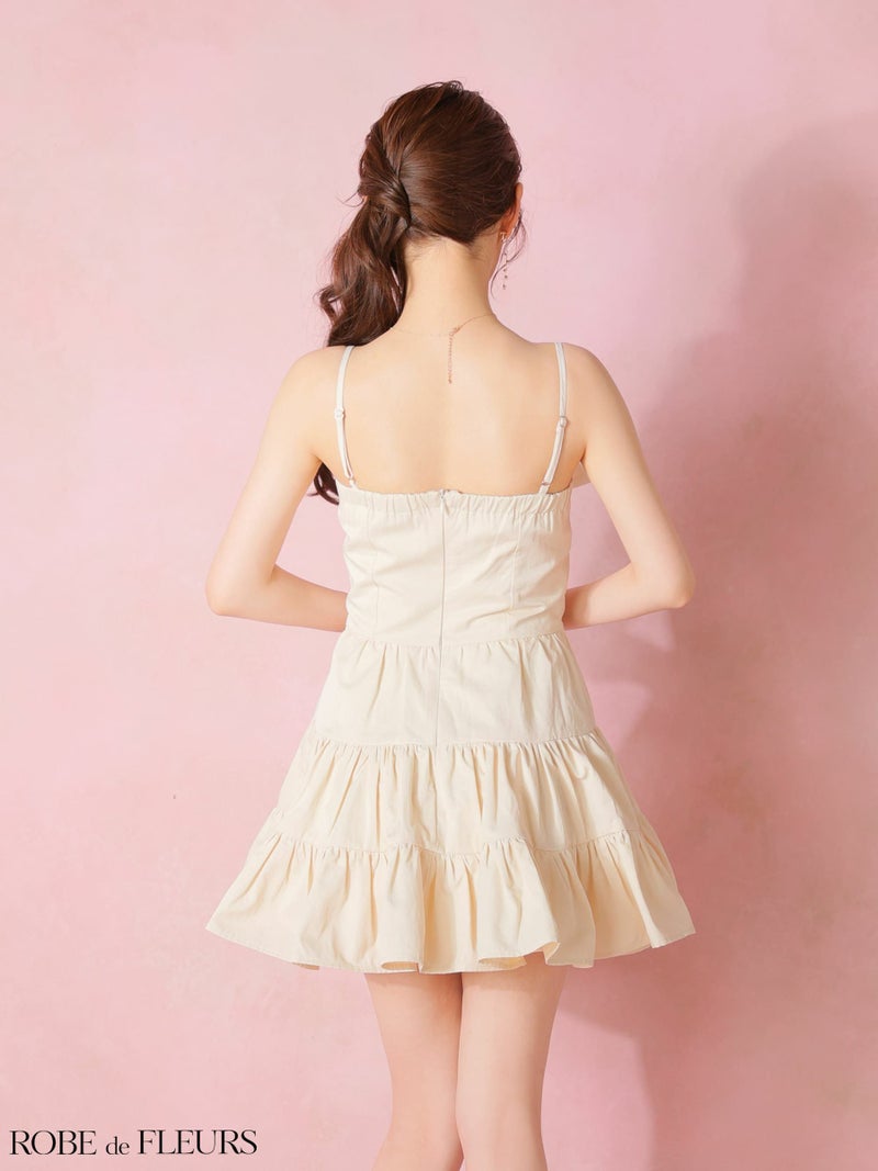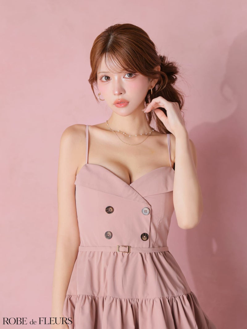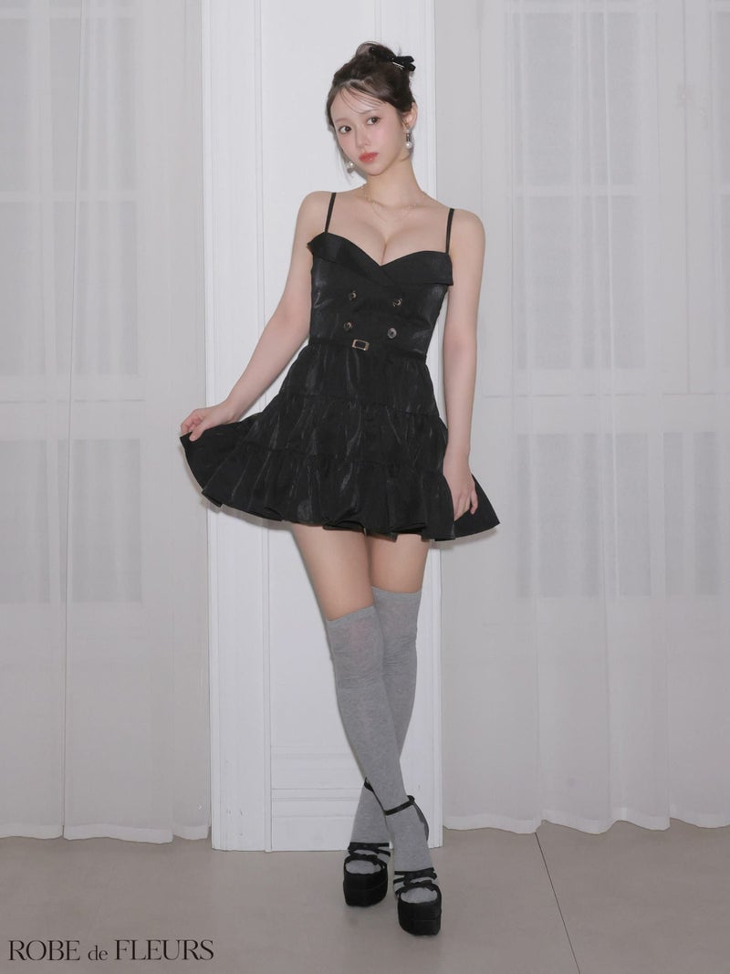 ウエストベルトでスタイルアップ効果抜群♡ [ROBEdeFLEURS/ローブドフルール] 高級 ブランド Aラインミニドレス 谷間 キャミソール ウエストベルト ダブルボタン ティアード ワンカラー