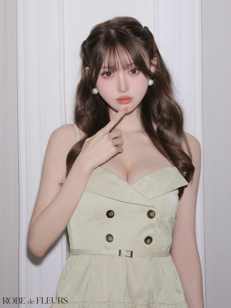 ウエストベルトでスタイルアップ効果抜群♡ 予約商品【2月中旬入荷予定】[ROBEdeFLEURS/ローブドフルール] 高級 ブランド Aラインミニドレス 谷間 キャミソール ウエストベルト ダブルボタン ティアード ワンカラー